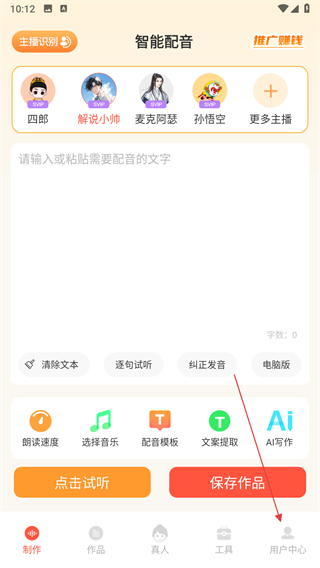 1、打開配音鵝APP,點擊底部導航欄用戶中心,進入個人頁面。