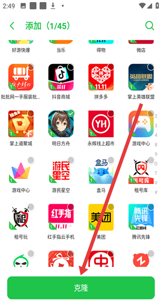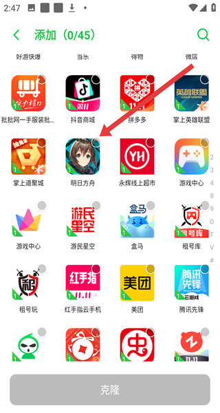 3、在應用添加頁面,點擊選擇需要克隆的應用如明日方舟。