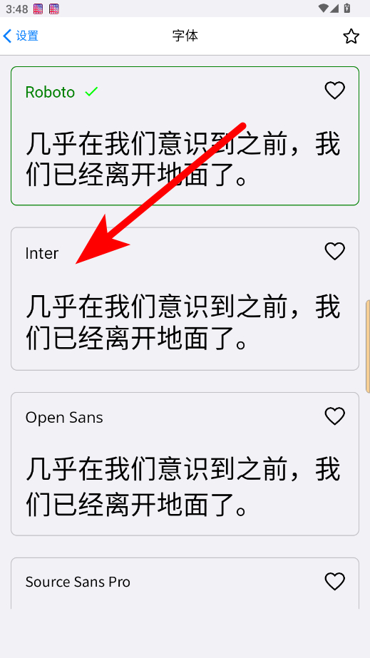 3、在字體設(shè)置界面,瀏覽并選擇喜歡的字體,如Inter。