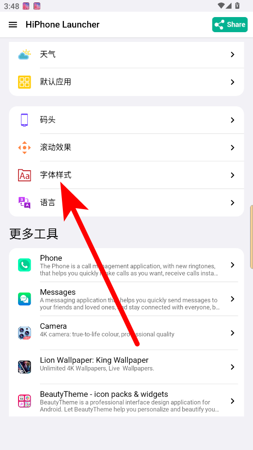 1、在HiPhone Launcher頁面,點(diǎn)擊壁紙選項(xiàng),進(jìn)入壁紙?jiān)O(shè)置頁面。