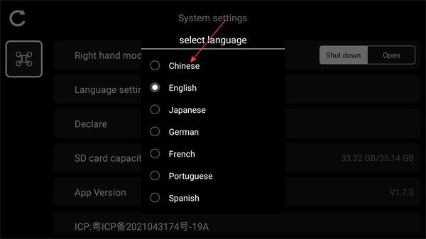 3、在彈出的語(yǔ)言選擇列表中,點(diǎn)擊Chinese選項(xiàng)。