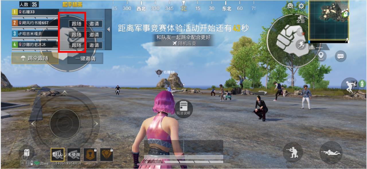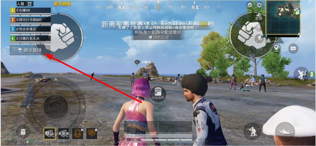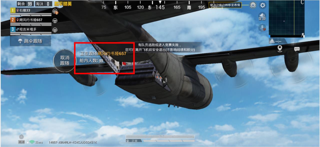 3、登上飛機(jī)后會(huì)顯示正在跟隨對(duì)應(yīng)隊(duì)友,等到隊(duì)友跳傘時(shí)你會(huì)一同跳出飛機(jī),實(shí)現(xiàn)跟隨隊(duì)友跳傘。
