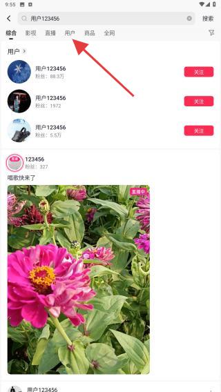 3、搜索結(jié)果出來(lái)后,點(diǎn)擊用戶進(jìn)行切換標(biāo)簽。