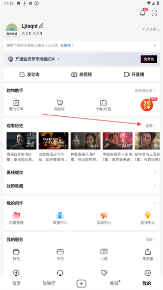 2、進(jìn)入我的頁(yè)面內(nèi),在觀看歷史的右側(cè)點(diǎn)擊全部的按鈕。