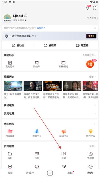 2、進(jìn)入個(gè)人中心的頁(yè)面內(nèi),在我的服務(wù)下點(diǎn)擊小說(shuō)。