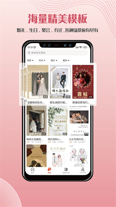 婚禮電子請(qǐng)柬、滿月酒寶寶百日(百天)、生日、壽宴、聚會(huì)通知、喬遷請(qǐng)柬、商務(wù)邀請(qǐng)(會(huì)議|活動(dòng)|開(kāi)業(yè))、節(jié)日祝福、放假通知、招聘簡(jiǎn)歷等海量模板免費(fèi)使用。