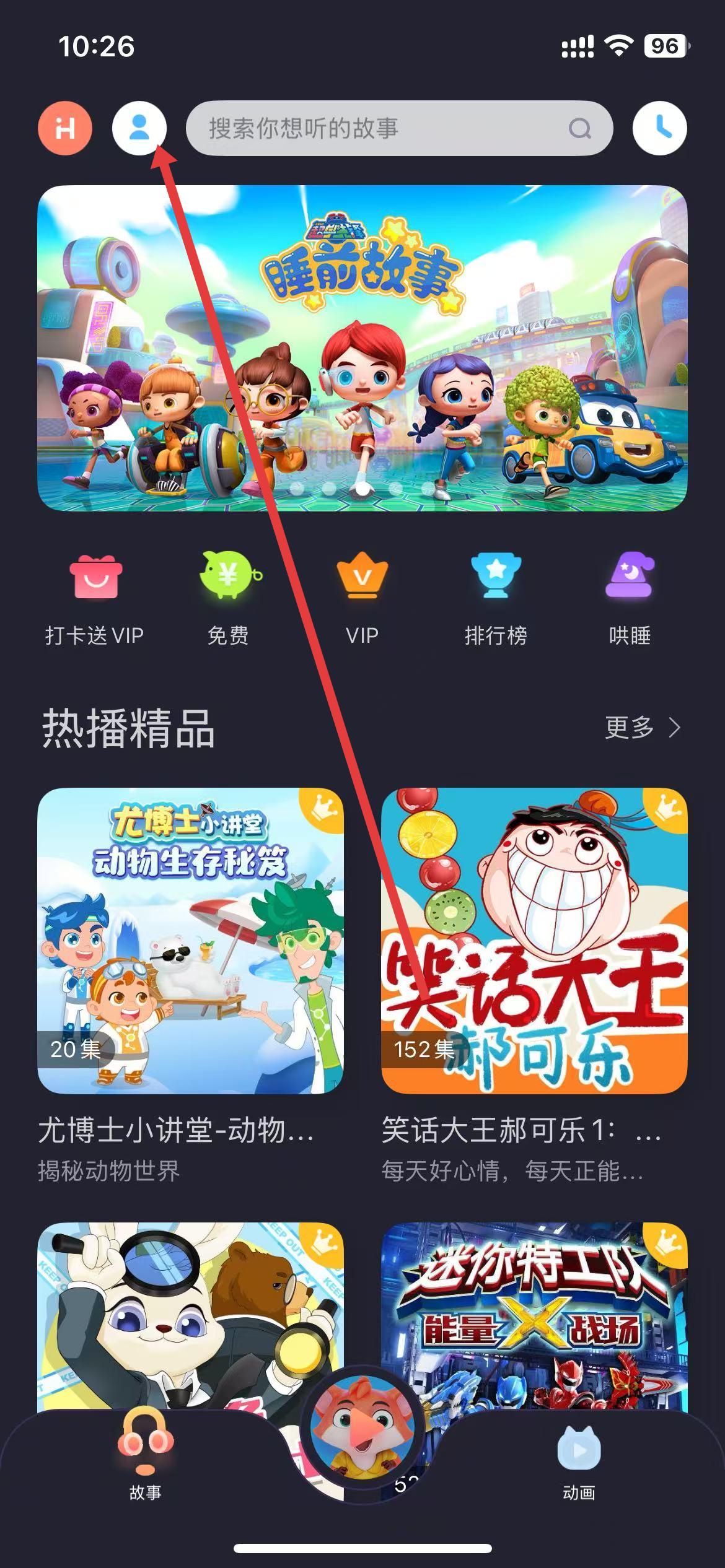 1、打開(kāi)洪恩動(dòng)畫(huà)故事,點(diǎn)擊左上角的頭像圖標(biāo)。