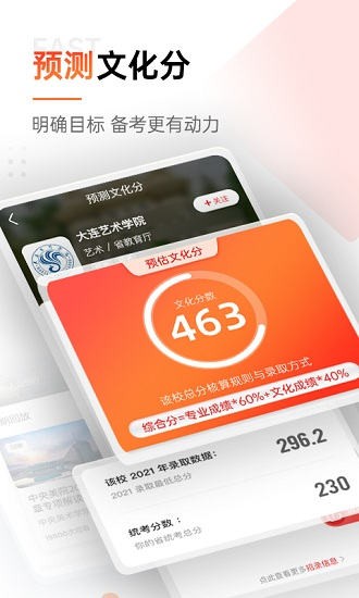 根據(jù)考生統(tǒng)考專業(yè)成績(jī)結(jié)合過往大數(shù)據(jù),快速預(yù)估所需文化分,讓考生備考更有目標(biāo)和動(dòng)力。