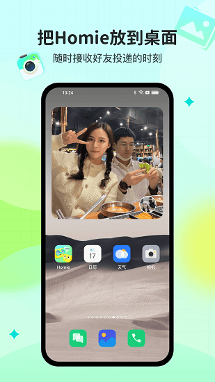 Homie是一個(gè)桌面小組件應(yīng)用,您可讓將照片直接發(fā)送到TA的主屏幕。把Homie放到桌面,隨時(shí)接收好友投遞的時(shí)刻。