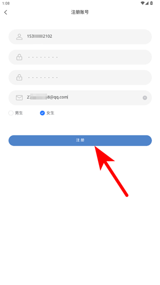 4、在注冊賬號(hào)頁面填寫賬號(hào)、密碼、郵箱,選擇性別后點(diǎn)擊注冊,完成賬號(hào)注冊。