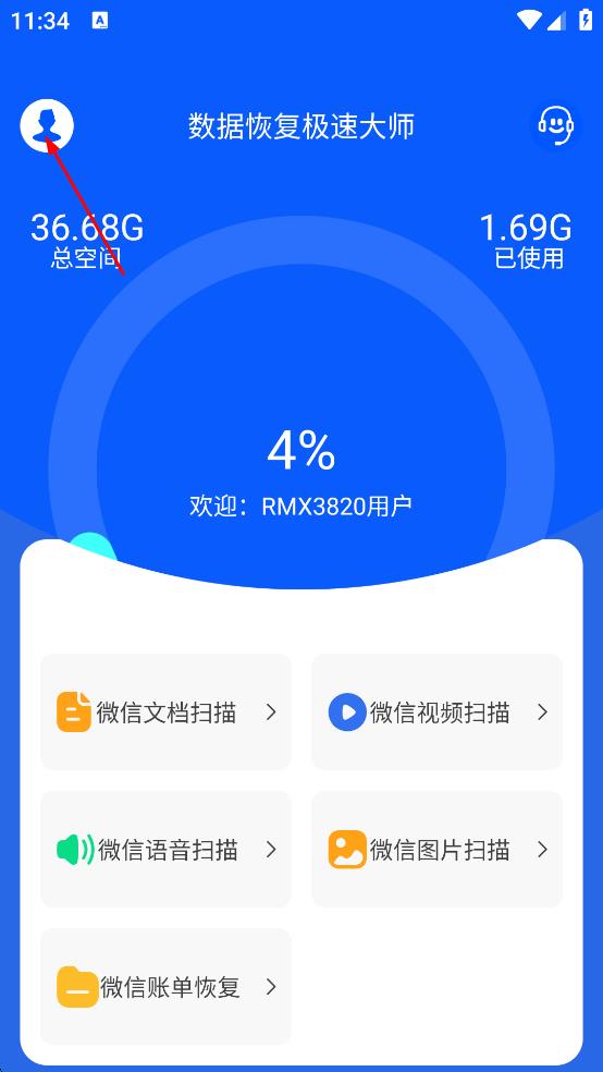 1、打開(kāi)數(shù)據(jù)恢復(fù)極速大師,點(diǎn)擊左上角頭像。
