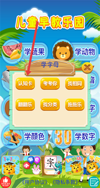 1、打開“兒童早教樂園”應用,點擊學字母選項,進入學字母功能界面。