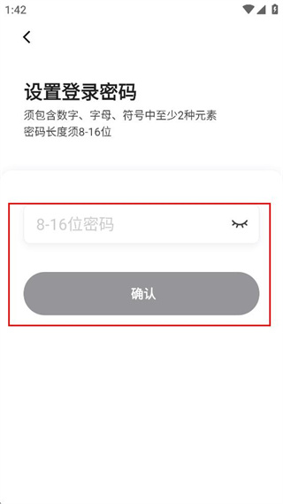 4、進(jìn)入設(shè)置登錄密碼頁面,設(shè)置包含至少2種元素且8-16位的密碼,點(diǎn)擊確認(rèn)按鈕。