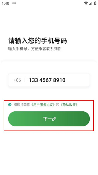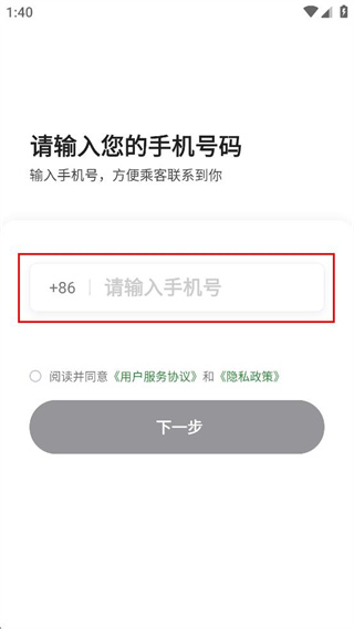 1、打開該司機(jī)端軟件進(jìn)入請(qǐng)輸入您的手機(jī)號(hào)碼頁面,在對(duì)應(yīng)輸入框填寫常用手機(jī)號(hào)。