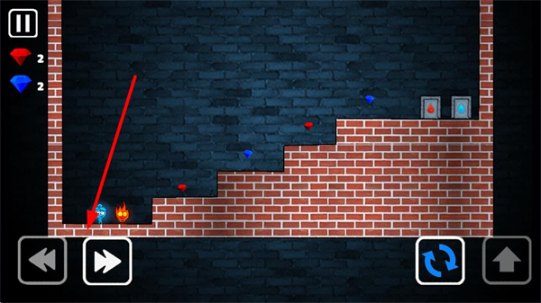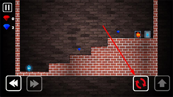 4、需點擊替換按鈕,操控冰人和火人分別收集對應(yīng)顏色的寶石,同時到達各自的目標區(qū)域,完成關(guān)卡挑戰(zhàn)。