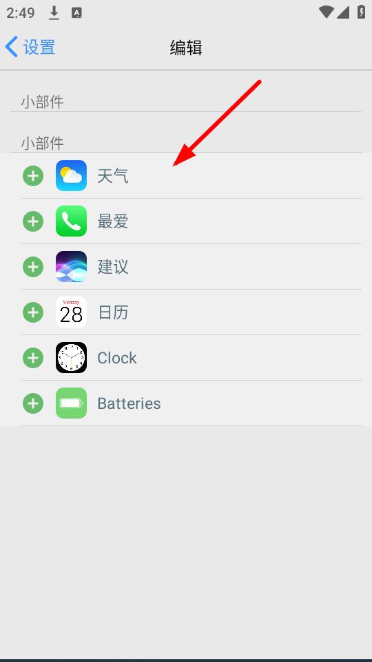 2、進(jìn)入編輯頁面,選擇想要添加到桌面的小部件,比如點擊天氣小部件進(jìn)行添加。