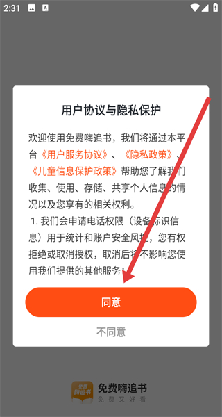 1、打開(kāi)免費(fèi)嗨追書(shū)APP,點(diǎn)擊同意按鈕,確認(rèn)用戶協(xié)議與隱私保護(hù),進(jìn)入主界面。