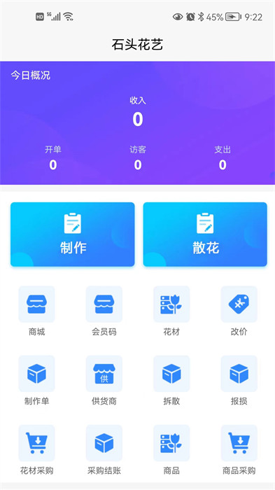 總覽商城、會員碼、制作單、改價、花材、商品、商品采購單、報損單、員工等功能。