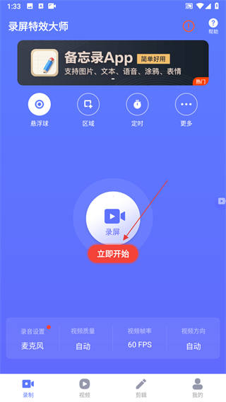 2、點(diǎn)擊錄屏按鈕后,界面出現(xiàn)立即開始按鈕,點(diǎn)擊該按鈕啟動(dòng)錄屏。