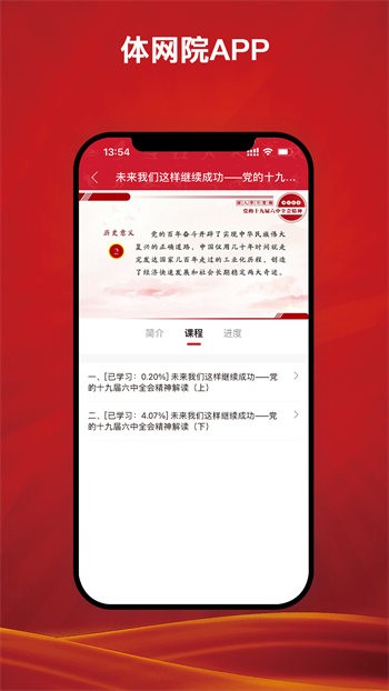 體育干部網絡學院APP使用賬號、手機號等方式登錄,一鍵便捷綁定個人身份作為唯一認證,內置視頻課程政策和教育進度等,包含每一期課程簡介、內容,線上課程教育體系完善,可以反復學習。