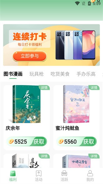 錦鯉寶藏上連續(xù)打卡簽到即可獲得福利,有圖書(shū)漫畫(huà)、玩具槍、吃貨美食、手辦樂(lè)高等豐富物品,每天精選圖書(shū)漫畫(huà)和豐富福利活動(dòng),低價(jià)即可兌換物品,完成任務(wù)使用金幣獲取超值禮包,各項(xiàng)福利不斷更新,總有你想要的。