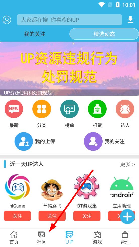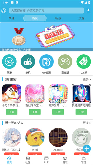 3、在首頁可以清晰看到網(wǎng)游、單機、UP資源、變態(tài)版、0.1折等不同的游戲分類,另外還有編輯推薦熱門游戲、近1天up達人等