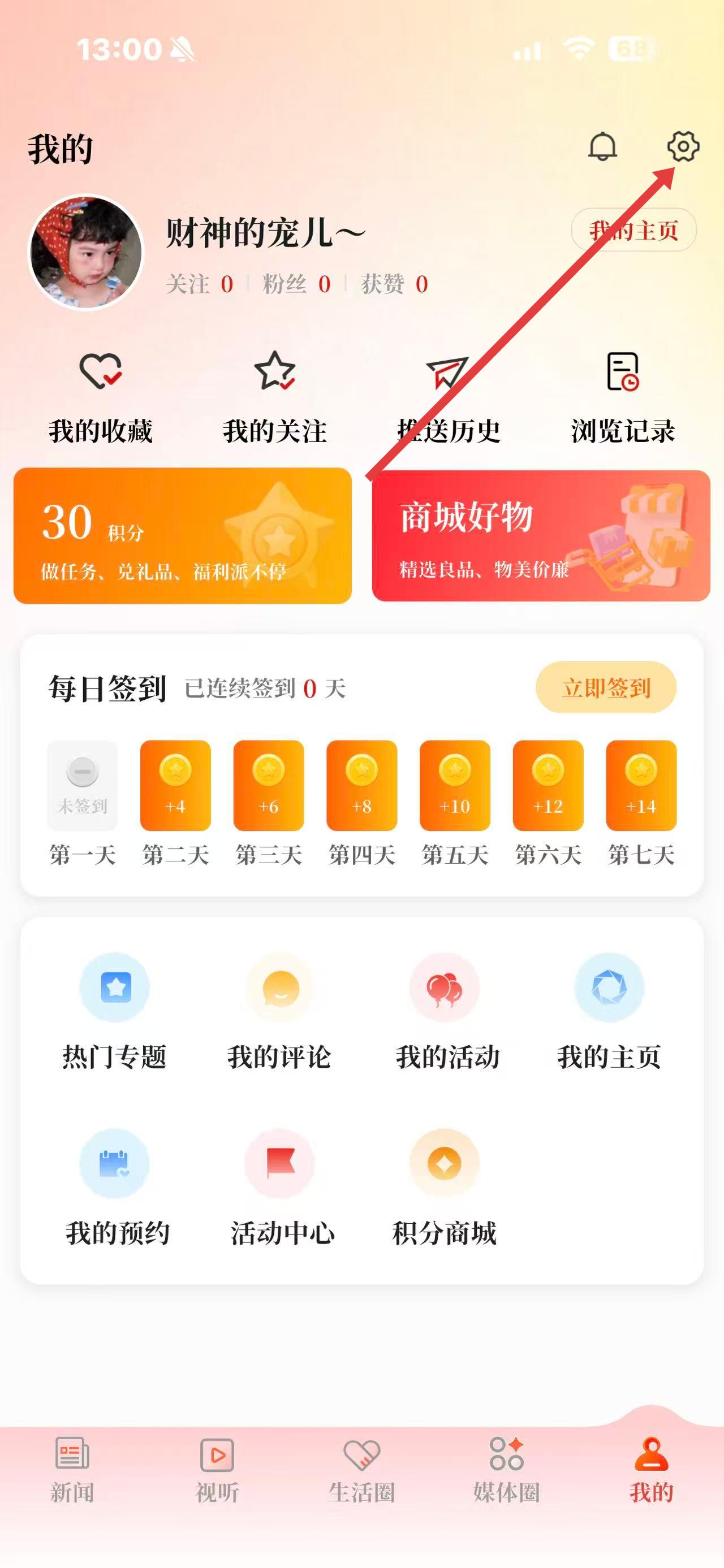 2、進入我的頁面后,點擊右上角的設(shè)置齒輪圖標(biāo)進入設(shè)置界面。