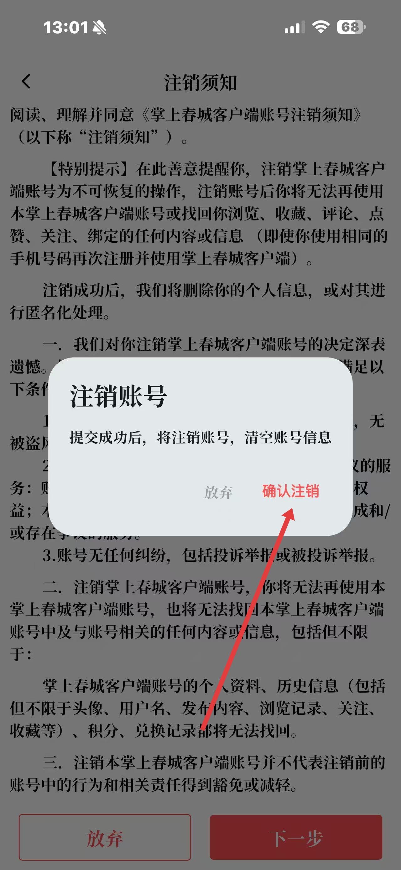 4、仔細閱讀注銷須知,確認后在彈出的提示框中點擊確認注銷完成賬號注銷。