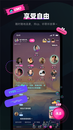 EMO派對是一款讓喜歡玩游戲的單身用戶社交的平臺,在這里的很多用戶在線會跟你互動的,你在這里是不會感到孤單的,而且還有很多的游戲玩法在這里為你推薦,各種類型的用戶在這里都有,你可以直接的在線上發(fā)現(xiàn)很多的社交用戶和各種游戲。