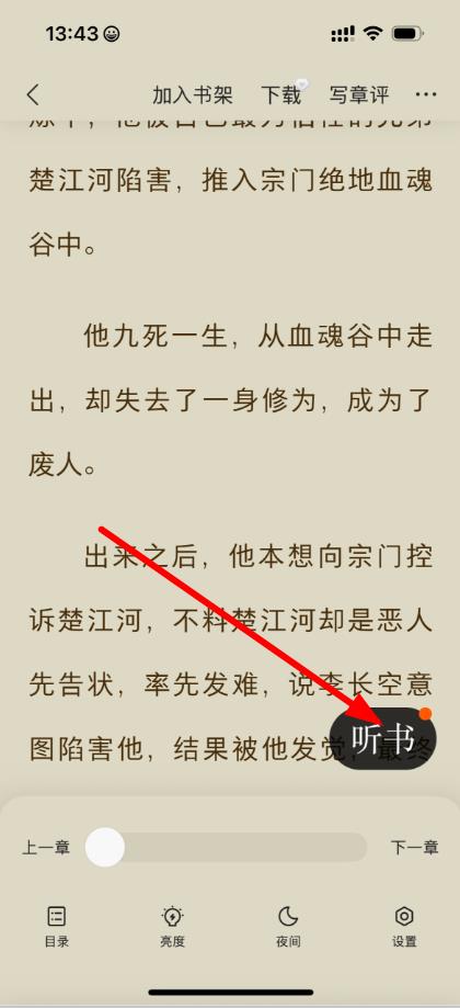 2、在小說閱讀界面,點擊屏幕,喚出底部功能欄,點擊右下角的聽書按鈕。