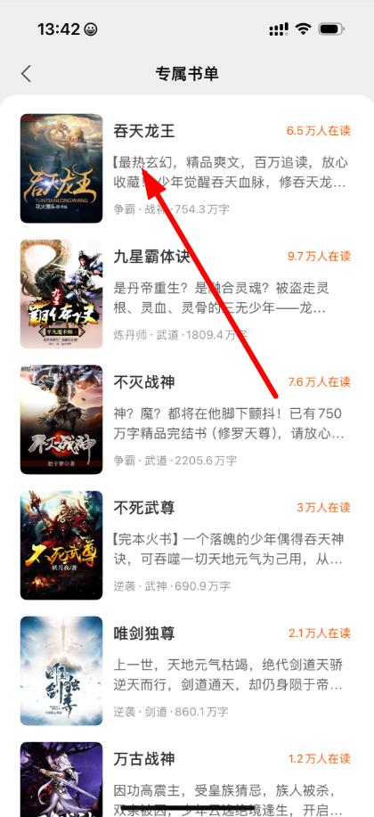 1、打開得間小說軟件,在專屬書單等界面中,選擇一本想要聽的小說,如《吞天龍王》,點擊進入閱讀界面。