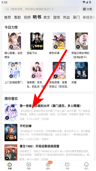1、在得間小說書城頁面,找到并點擊想要調(diào)整語速的聽書書籍。