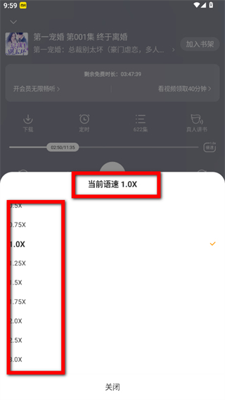 4、在語速選擇列表中,點擊想要的語速選項,即可調(diào)整聽書語速。