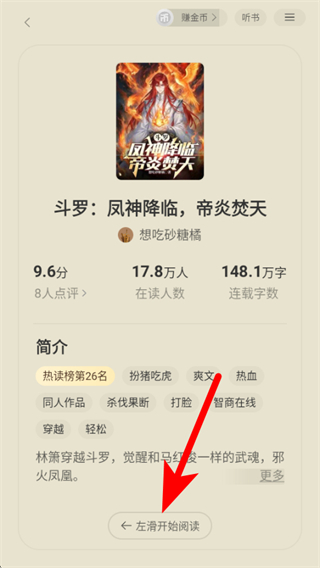 2、在小說詳情頁面,左滑開始閱讀,進入小說閱讀界面。