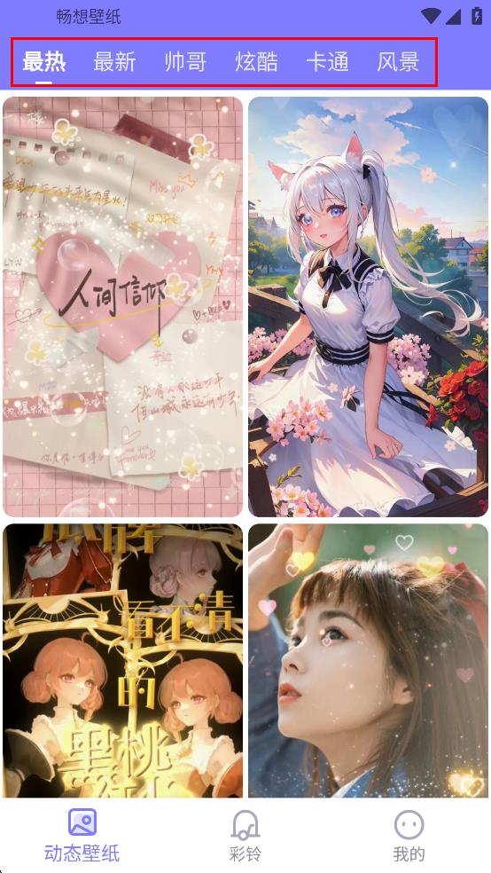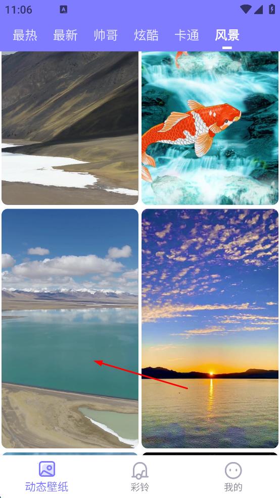 1、打開暢想壁紙軟件,進入軟件界面,在界面上方的分類欄里,找到標有“風景”字樣的選項,點擊該選項,進入風景壁紙展示頁面。