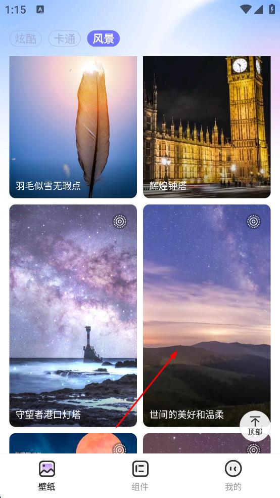 1、打開壁紙軟件,在頂部分類欄中找到感興趣的壁紙分類,點擊該分類,進入風景類壁紙展示頁面。