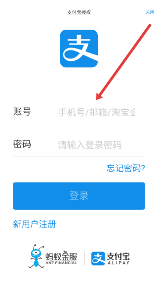 3、在跳轉(zhuǎn)到支付寶登錄頁面后,點擊輸入框依次輸入賬號和密碼完成登錄操作。