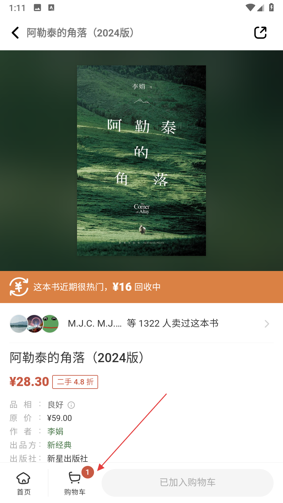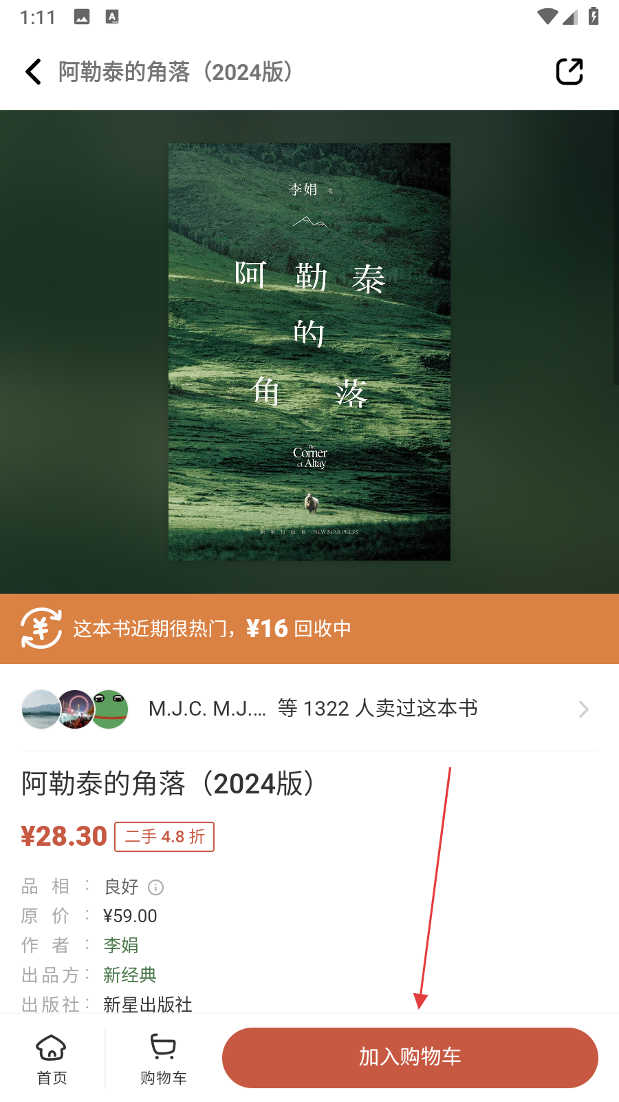 2、在商品詳情頁,查看價格、品相等信息,確認要購買后,點擊加入購物車。