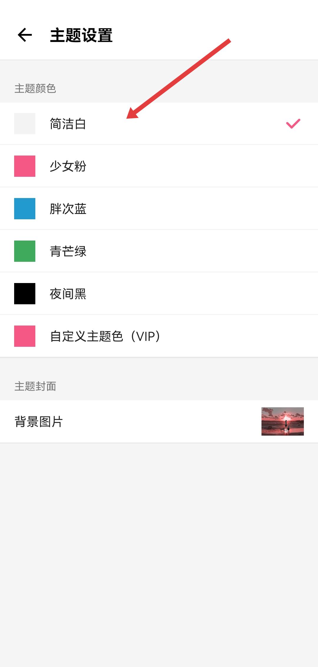 3、在主題設(shè)置頁面的主題顏色列表中,可以看到簡潔白、少女粉等多種主題顏色選項。