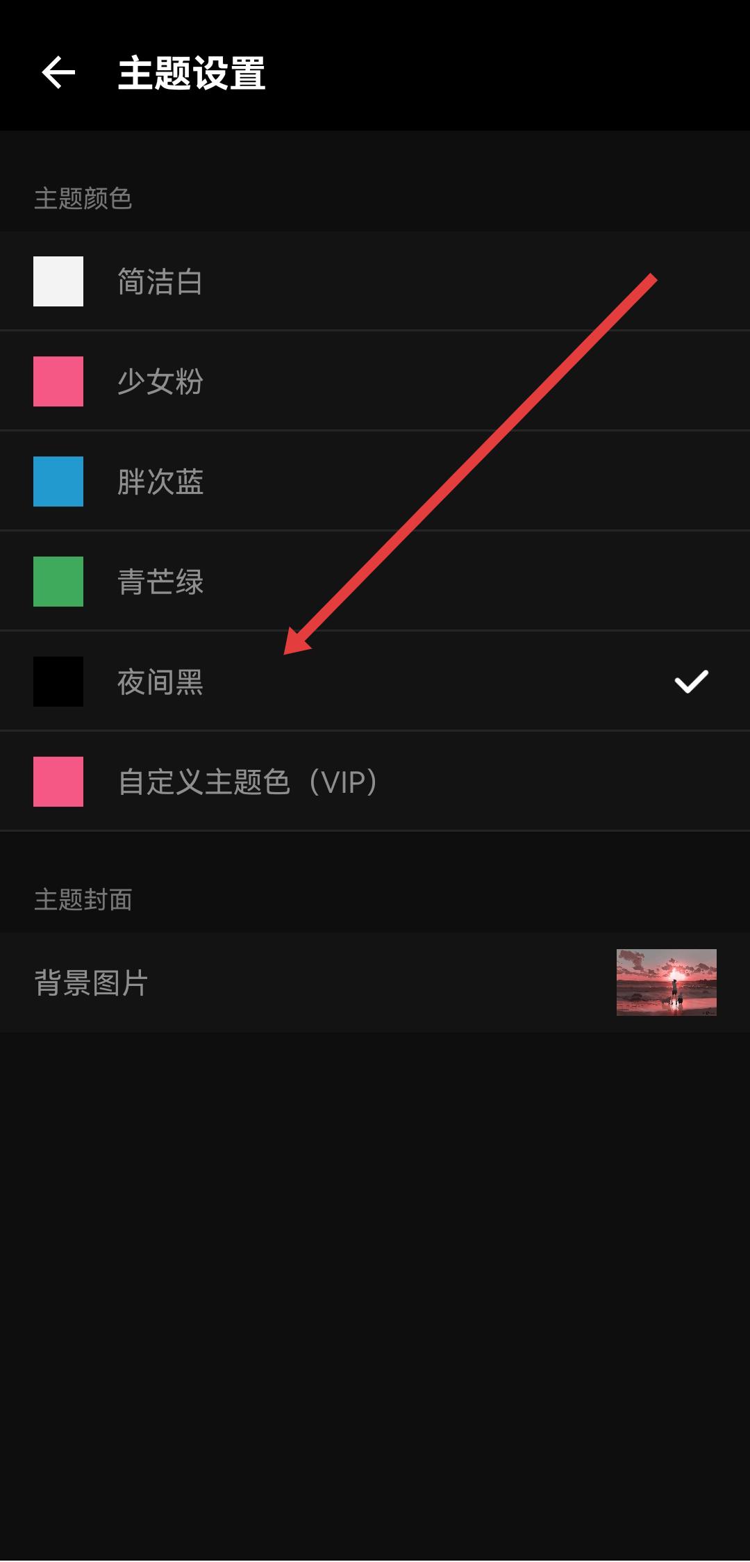 4、選擇想要的主題顏色如夜間黑,即可完成元氣壁紙的主題設(shè)置。