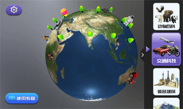 - 自由篩選顯示的內(nèi)容展示在AR地球儀上,包含了動(dòng)物百科、交通科技、著名建筑等眾多選項(xiàng);