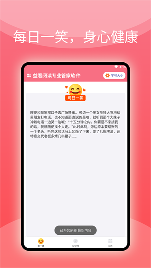 益看閱讀專業(yè)管家軟件是一款貼心的閱讀和安全管家,帶來放大鏡閱讀給大家使用,每日推薦眾多趣味的小故事給大家在線閱讀,可以根據(jù)自己的喜好自由設(shè)置字體大小,讓大家可以更好的閱讀,體驗到安全守護服務(wù),還有便捷的日歷服務(wù)使用。