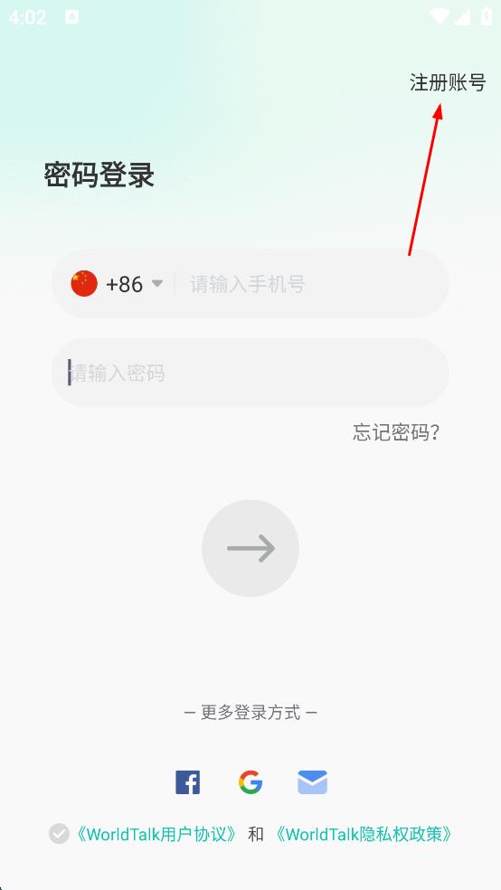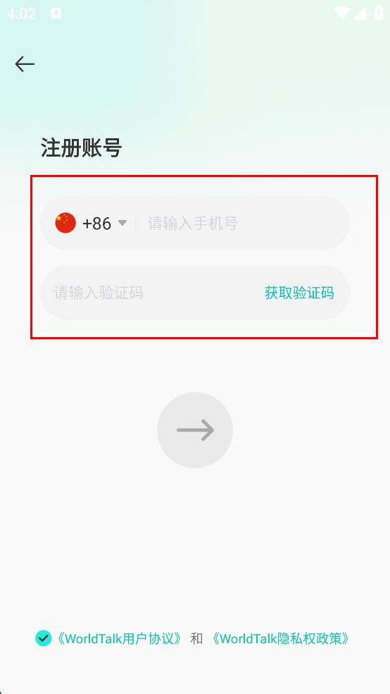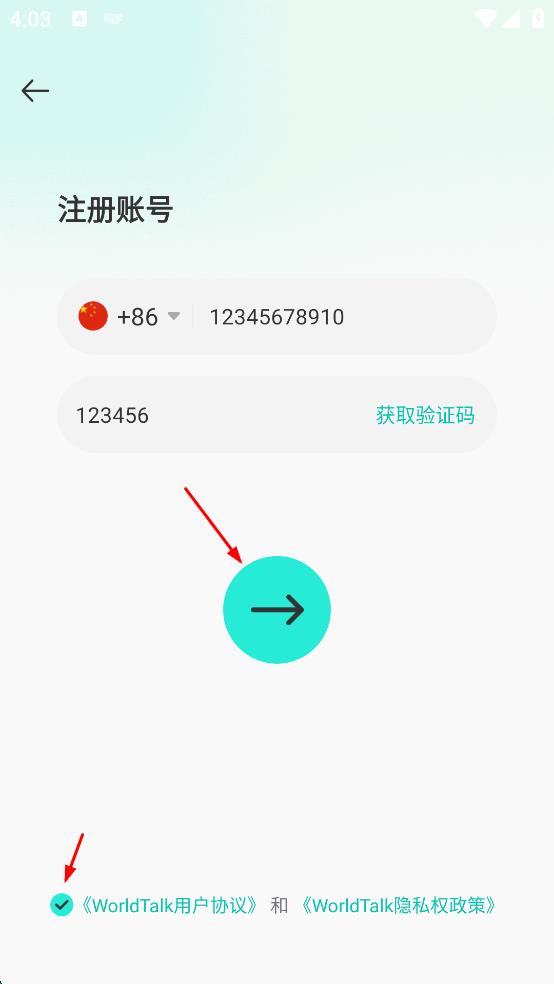 4、輸入手機(jī)號和驗(yàn)證碼后,勾選WorldTalk用戶協(xié)議和WorldTalk隱私權(quán)政策,點(diǎn)擊界面中間的箭頭按鈕,繼續(xù)完成注冊流程。