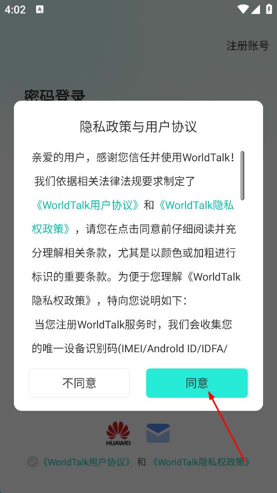 1、打開WorldTalk,進(jìn)入隱私政策與用戶協(xié)議界面,界面說明依據(jù)法律法規(guī)制定了WorldTalk用戶協(xié)議和WorldTalk隱私權(quán)政策,注冊時(shí)會收集唯一設(shè)備識別碼,點(diǎn)擊“同意”按鈕。