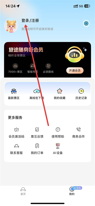 2、在我的頁(yè)面中,找到并點(diǎn)擊登錄/注冊(cè)區(qū)域。