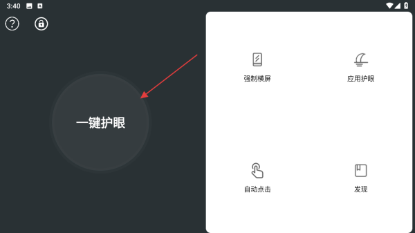1、打開相關(guān)應(yīng)用進入護眼操作界面,找到一鍵護眼按鈕點擊,呼出更多護眼相關(guān)功能選項,如強制橫屏、應(yīng)用護眼等,為開啟夜間護眼做準備。