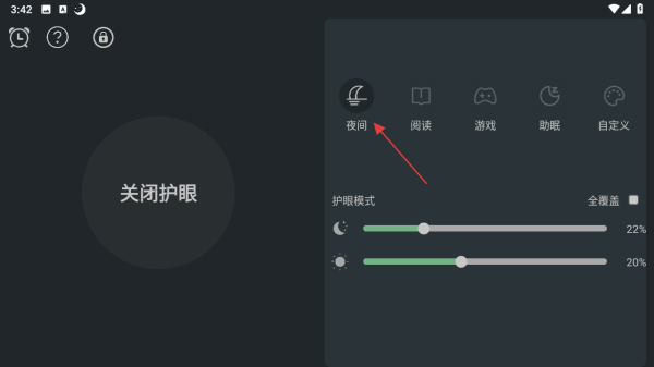3、在護眼模式設(shè)置區(qū)域上方,點擊夜間選項,應(yīng)用會自動適配夜間使用的護眼參數(shù),營造更柔和舒適的夜間屏幕顯示環(huán)境,減少眼睛疲勞。