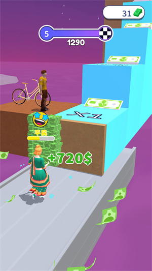 沖到終點(diǎn),你擁有的貨幣的多少將決定你的身份,讓自己在跑酷的道路上收集更多的金錢,躲避所有的障礙物,完美的抵達(dá)終點(diǎn)來完成所有的挑戰(zhàn),獲得獎(jiǎng)勵(lì)。