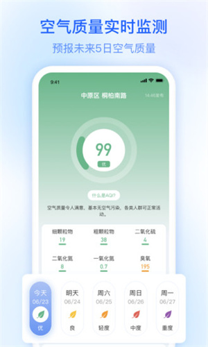 - 實時的檢測當(dāng)天的空氣質(zhì)量的情況,也可以讓用戶更輕松的了解具體的數(shù)據(jù)顯示。