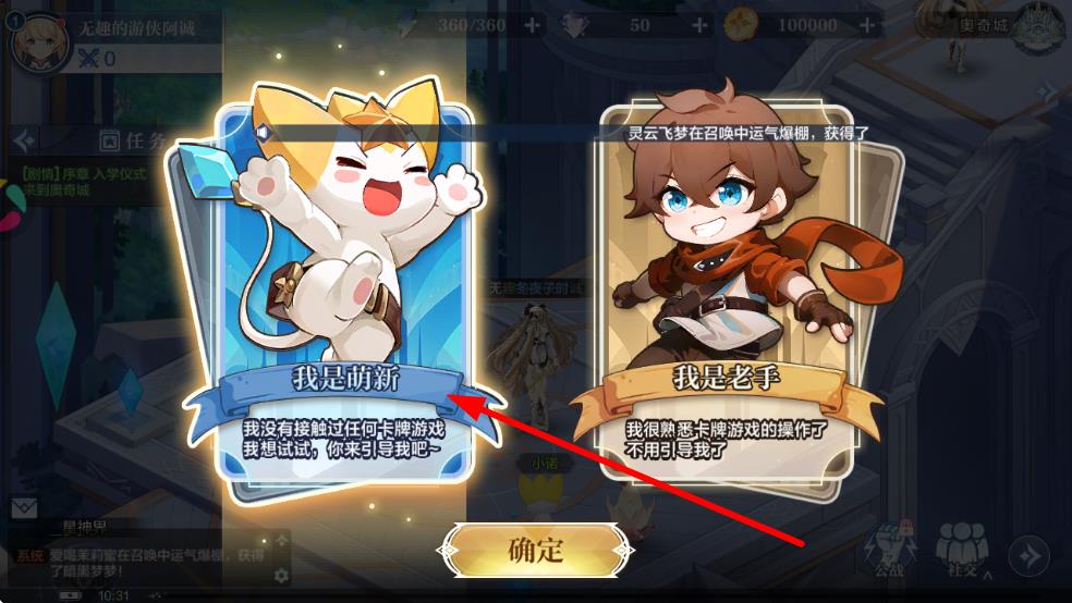 3、完成創(chuàng)角后,進(jìn)入新手引導(dǎo)選擇界面,根據(jù)自身情況選擇我是萌新或我是老手,點(diǎn)擊確定,正式進(jìn)入游戲,完成新賬號(hào)創(chuàng)建流程。
